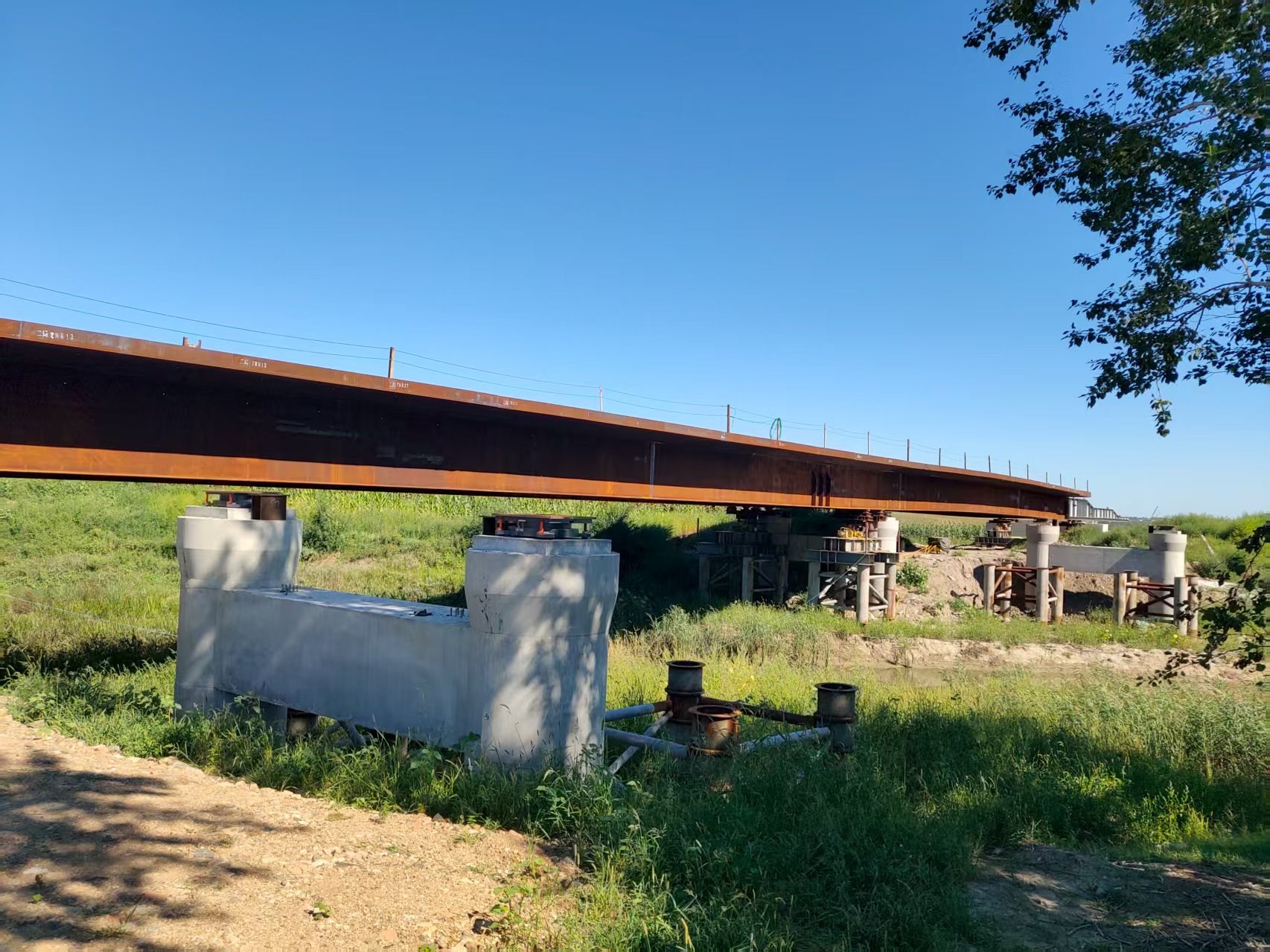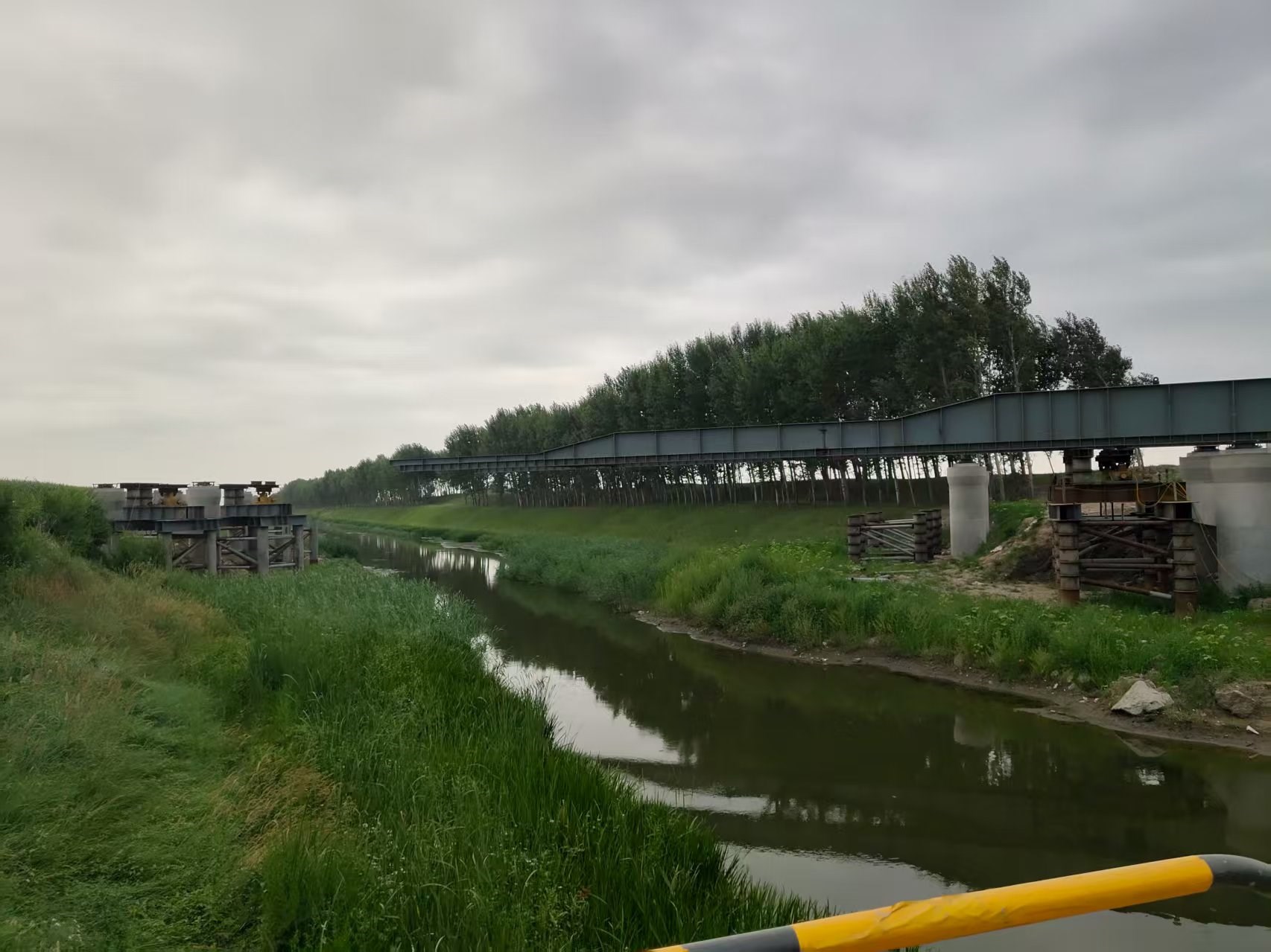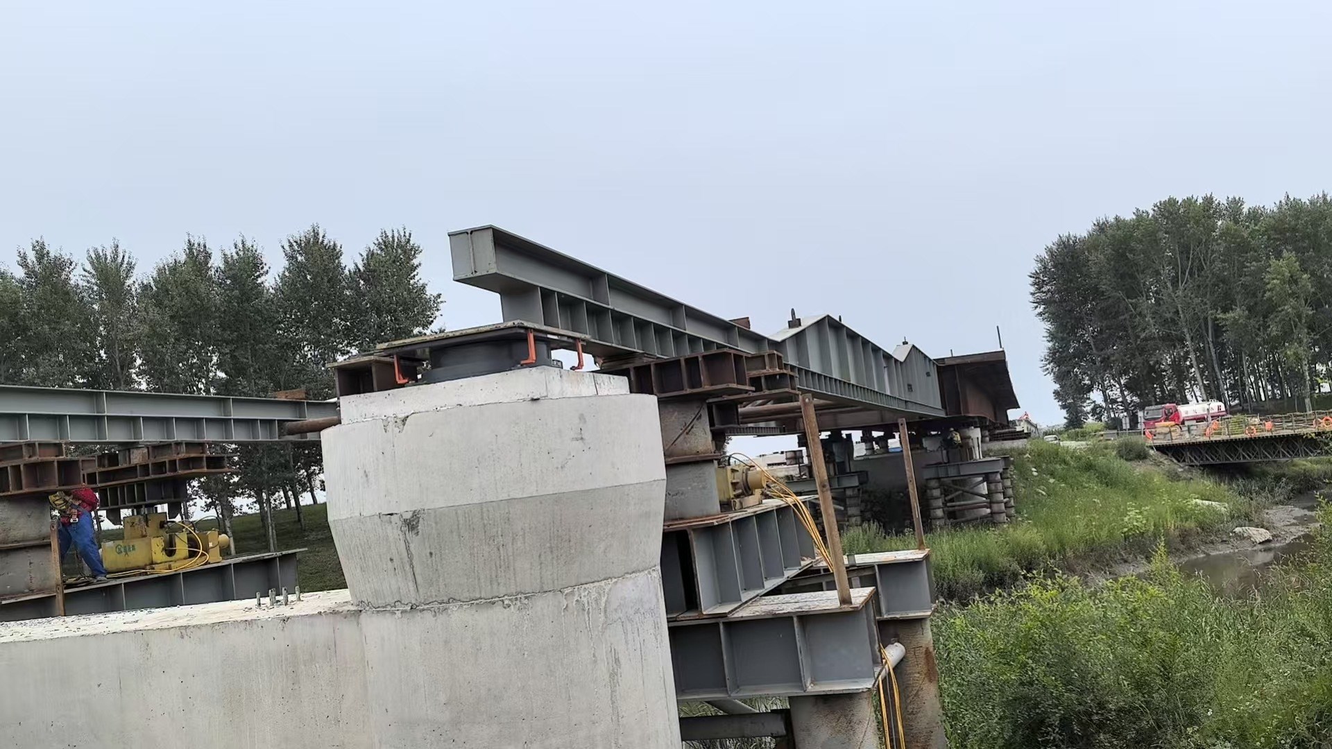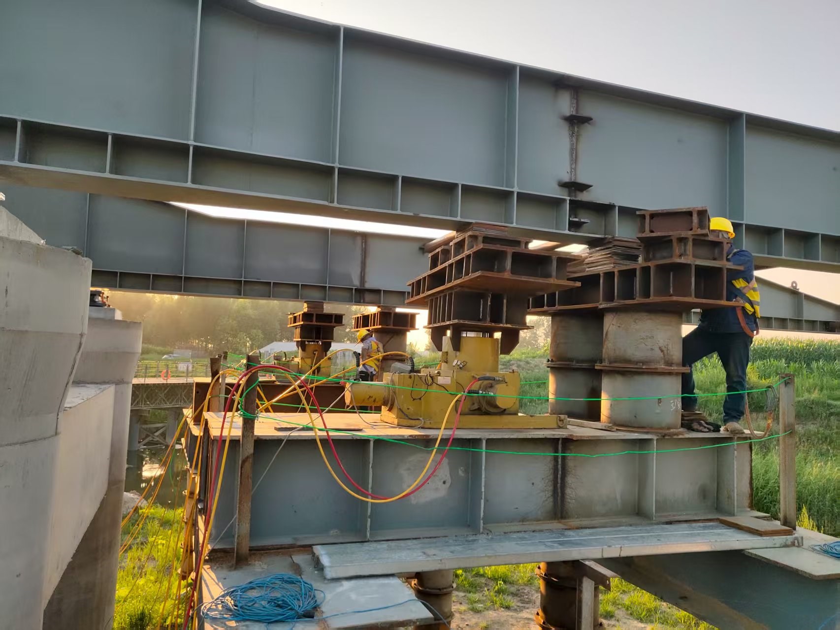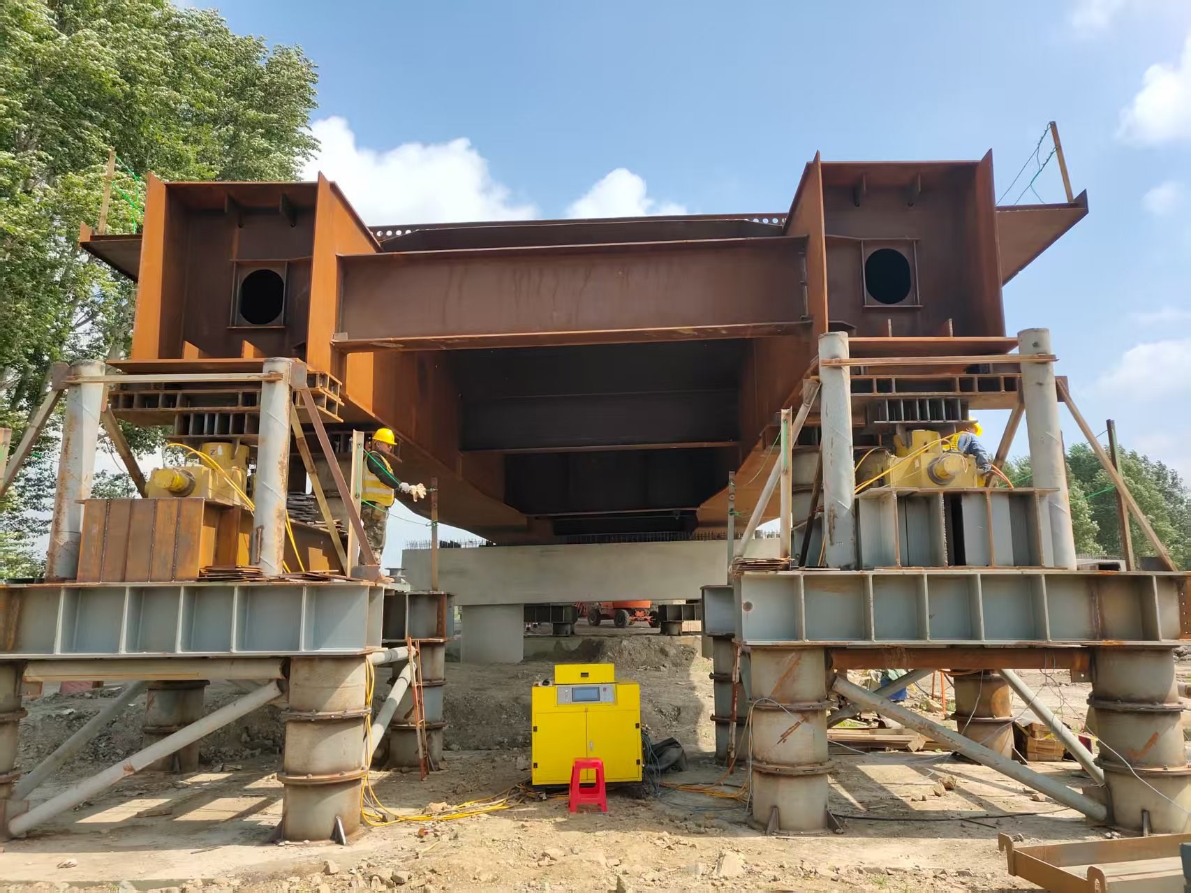 山東超晟輝在本項目中主要負責洼中高排水總干渠大橋的關鍵施工環節。該大橋采用3孔55米雙扁鋼箱-混凝土組合梁結構設計,共計兩幅橋梁,單幅橋梁重量達1000噸。為確保項目順利推進,山東超晟輝配備了優良的技術團隊,派遣2名經驗豐富的技術人員駐場指導,同時提供了多套高性能頂推設備,為項目建設提供了堅實的技術保障和設備支持。